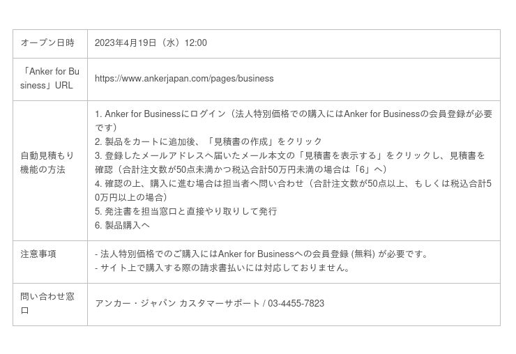 米国・日本・欧州を中心にデジタル関連製品でトップクラスの販売実績を誇るAnkerグループの日本法人、アンカー・ジャパン株式会社(本社:東京都千代田区、代表取締役CEO:猿渡 歩)は、法人のお客様の利便性を追求し、自動見積もり機能を搭載した法人向け公式サイト「Anker for Business」を2023年4月19日(水)にオープン致します。