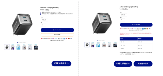 「Anker for Business」は、法人のお客様の利便性を追求し、法人価格での注文、見積書発行、そして支払いまで一気通貫で完了できる法人向けの公式サイトです。従来は窓口への対応でのみ導入に関するお問合せを承っていましたが、本サイト上で手間なく製品1個からの購入が可能な他、自動見積もり機能によって時間を短縮し、スムーズに製品の導入をご検討いただけます。