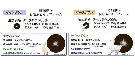 2025年はお買い求めやすい【ダックプラン】と高価な羽毛ふとんのお客様におすすめする【グースプラン】をご用意しております。