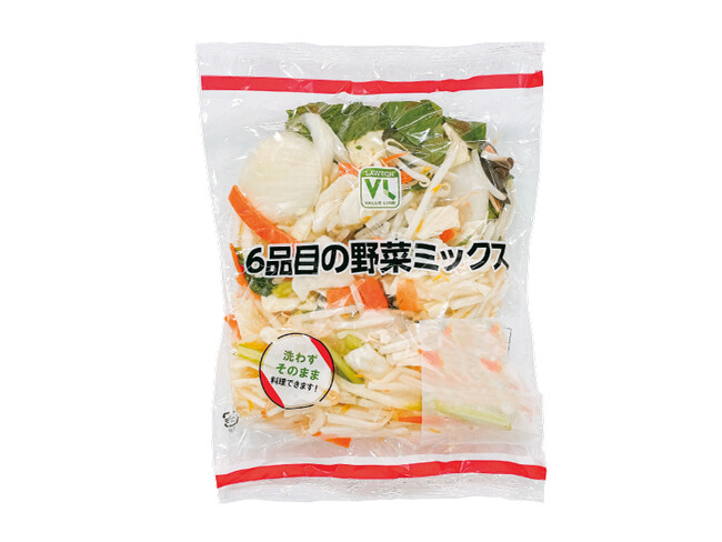 もやし・キャベツ・玉ねぎ・人参・きくらげ・小松菜の6品目のミックス野菜です。6品目の野菜を購入するとなると、使い切るのがとても難しいですが、カット野菜であれば手軽にムダなく、使い切ることができます。きくらげやキャベツ、玉ねぎの食感を生かし、炒め物などにご活用いただけます。
