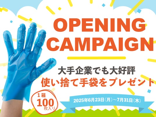オープニングキャンペーン2,000円(税込)以上お買い上げのお客様に「ストレッチポリエチレン手袋100枚入り」をもれなくプレゼント!