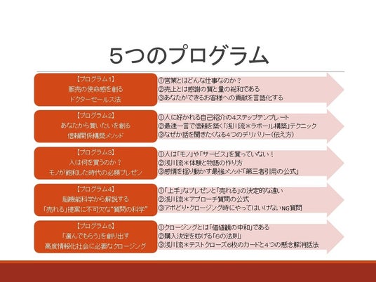 (1) 科学的に体系化された営業スキル習得法「信頼構築構築」「質問の科学」「モノが飽和した時代の提案」「高度情報化社会の2種類のクロージング」等、プレゼンテーションを10ステップで学習。コンテンツは行動心理学・脳科学の理論をベースに、誰でも成果を再現できるよう設計されています。