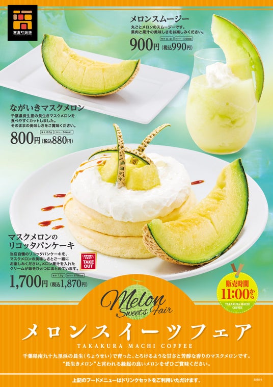 甘くて芳醇なマスクメロンを、爽やかなメロンクリームとともに楽しめる「マスクメロンのリコッタパンケーキ」に加え、果肉と果汁の美味しさがストレートに伝わる、「メロンのスムージー」やメロンを食べやすくカットした「ながいきマスクメロン」なども登場。この時期だけの『高倉町珈琲』自慢のスイーツメニューを、期間限定で、ぜひお楽しみください。