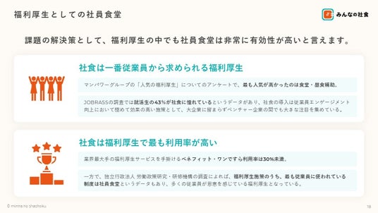 「人気の福利厚生」についてのアンケートで、最も人気が高かったのは食堂・昼食補助というデータもあります。