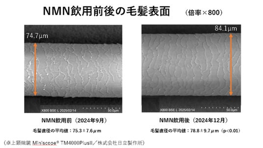 - NMN摂取後、毛髪直径の平均値が有意に増加(p<0.01)するなど、毛髪の伸長や太さ、表面など外観面で明確な変化が確認されました。