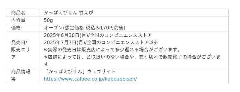 カルビー株式会社(本社:東京都千代田区、代表取締役社長兼CEO:江原 信)は“やめられない、とまらない♪”でおなじみの「かっぱえびせん」より、上質な甘みと旨みを持つ甘えびを100%使用した『かっぱえびせん 甘えび』を2025年6月30日(月)から全国のコンビニエンスストア先行で期間限定発売します。コンビニエンスストア以外の店舗では2025年7月7日(月)から期間限定発売します(2025年10月中旬終売予定)。