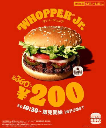 バーガーキング(R) 自慢の直火焼きの100%ビーフパティを使用した人気商品『ワッパー(R) ジュニア』を、特別価格の200円で販売するキャンペーンを1週間限定で開催いたします。朝10時30分から夜までの終日、お得な200円で本格バーガーをお楽しみいただけます。