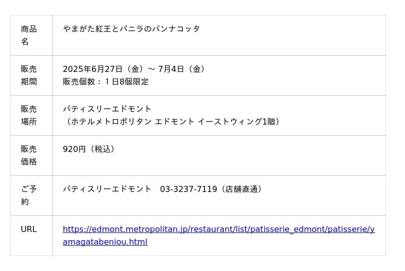ホテルメトロポリタン エドモント(所在地/東京都千代田区飯田橋、総支配人/小林正明)の「パティスリーエドモント」では、山形県が誇るさくらんぼの新品種「やまがた紅王(べにおう)」を贅沢に使用した新作カップデザート「やまがた紅王とバニラのパンナコッタ」を、2025年6月27日(金)から7月4日(金)までの8日間限定で販売いたします。