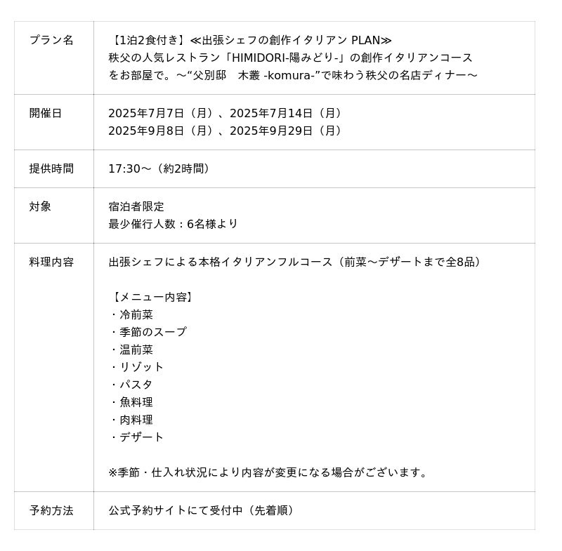 株式会社ブッキングリゾート(本社:大阪市北区、代表:坂根 正生)が運営する「秩父別邸 木叢-komura-」では、「HIMIDORI-陽みどり-」出張シェフ付き宿泊プランの追加開催が決定しました。