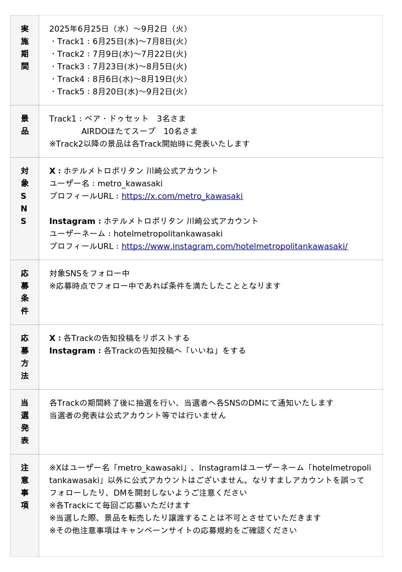 開催期間の2025年6月25日(水)~9月2日(火)を5つの「Track」に分けて、それぞれ異なる景品をご用意いたしました。ホテルからのプレゼントの他、一部の景品として直営オールデイダイニング「Terrace and Table」にて開催している北海道ビュッフェ旅でコラボレーションしている、株式会社AIRDOのオリジナルグッズも登場いたします。さらに北海道への旅にいざなうスペシャルプレゼントも予定しております。