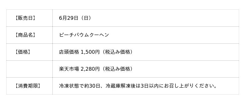 「ピーチバウムクーヘン」は、全店舗で冷凍状態にて販売。しっかりとケーキトレーに収め、美味しさを閉じ込めて密封。形がくずれることなく、美しいまま、出来立ての味わいをそのままお届けします。