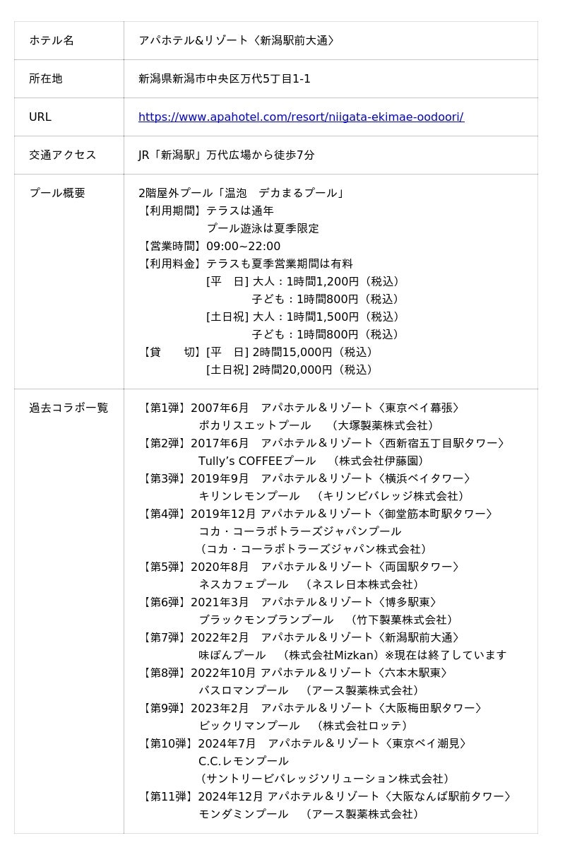 アパホテルのプール施設は各企業とコラボレーションしており、今回のアパホテル&リゾート〈新潟駅前大通〉はアース製薬とのコラボによる「温泡 デカまるプール」としてオープンし、スポンサー企業・商品の宣伝を行いながら、お客様の満足度向上を目指した運営をおこなっていく。