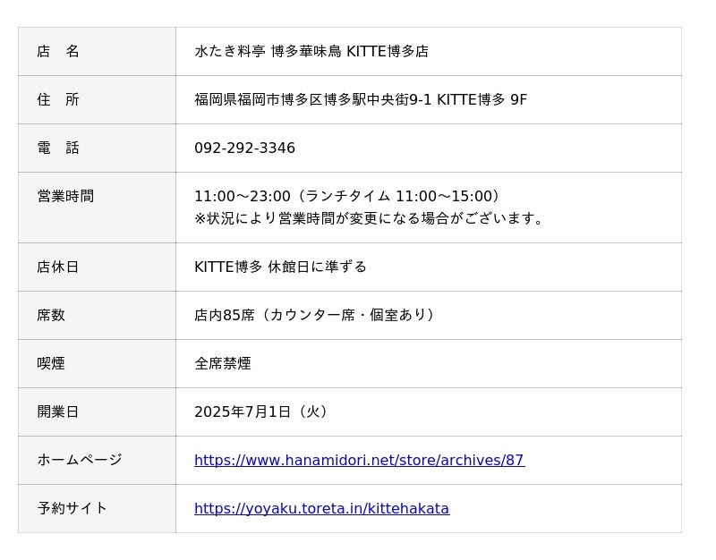 トリゼンダイニング株式会社(本社:福岡市博多区/代表取締役社長:河津 善博)は、2025年7月1日(火)にKITTE博多の9Fに、福岡地区では11店舗目となる「水たき料亭 博多華味鳥 KITTE博多店(みずたきりょうてい はかたはなみどり きってはかたてん)」をオープンいたします。