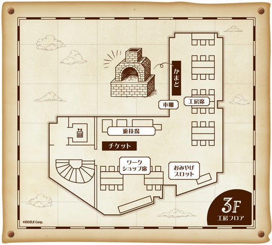3F 工房フロアには、オリジナルキーホルダーやアクセサリー、缶バッジなどモノづくりをお楽しみいただける工房席や、アーケードゲーム「ドズ走」、コラボプリントシール機、コラボスタンプ作成などを楽しめる遊技場、好きな天然石とお花を選んで作る「エレメンタリウム」をお楽しみいただけるワークショップ席などがございます。
