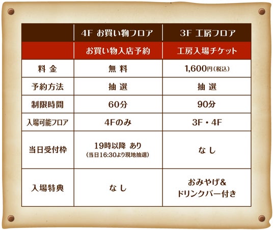 ・無料でご入場頂けますが、混雑時は事前抽選による入店予約が必要となります。