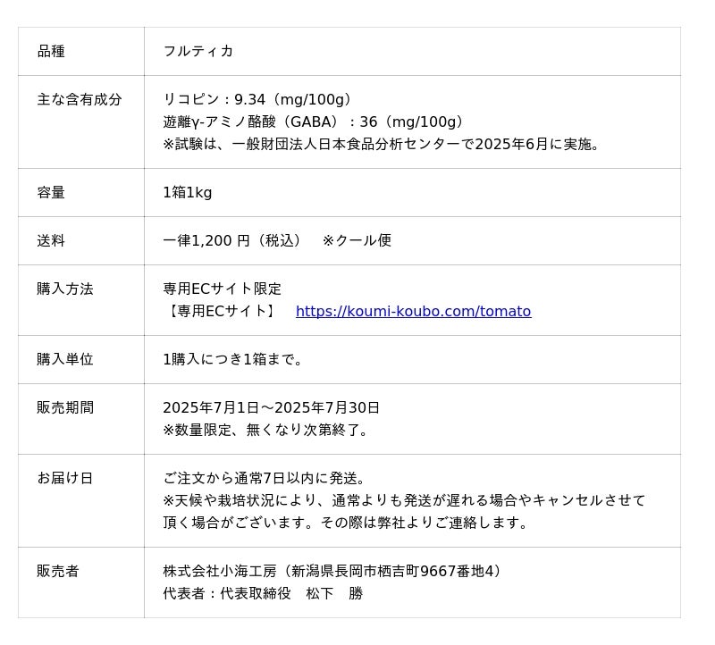 株式会社小海工房(本社:新潟県長岡市)は、あぐらって長岡共同企業体(株式会社小海工房および株式会社ひとつぶ(本社:新潟県長岡市))が共同管理し長岡市が運営する次世代農業推進拠点施設(通称「あぐらって長岡」)内のスマート園芸施設(以下「スマート施設園芸 試験棟」といいます)で栽培された高糖度のフルーツトマト(品種:フルティカ、販売名称:「これからのトマト“これトマ”」。以下「これトマ」といいます)の試験販売を、2025年7月1日から専用ECサイトで開始します。