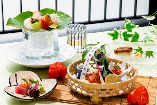 見た目にも涼やかな氷鉢に蝦夷鮑を添えて贅沢に仕上げる素麺や、旬の食材を彩り豊かに盛り合わせた季節の八寸、鱧の押し寿司などを一度に楽しめる昼食限定の御膳料理です。