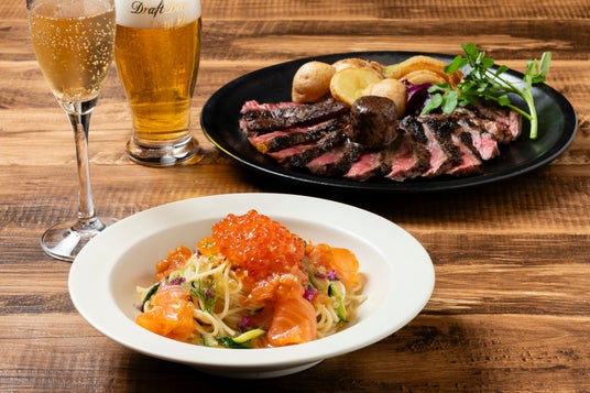 豪快ステーキのスタミナ料理や、自家製スモークサーモンといくらのひんやりパスタを期間限定でご提供します。