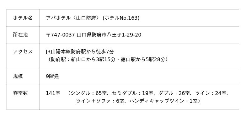アパホテル〈山口防府〉公式HP:https://www.apahotel.com/hotel/chushikoku/yamaguchi/yamaguchi-hofu/