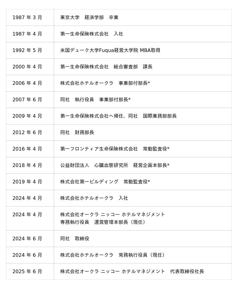 代表取締役社長に就任した高坂 秀周は、東京大学卒業後、約35年以上にわたる金融機関でのキャリアを経て、2024年に株式会社オークラ ニッコー ホテルマネジメントの専務執行役員に就任。運営管理本部長として、経営視点を取り入れた運営マネジメントを推進し、国内外のグループホテルを統括する中核的な役割を担ってまいりました。