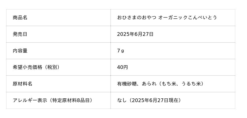 シリーズ第一弾として登場するのが、「おひさまのおやつ オーガニックこんぺいとう」。有機砂糖を使用し、自社の有機認証工場で職人が手作りする世界初※のオーガニック金平糖です。