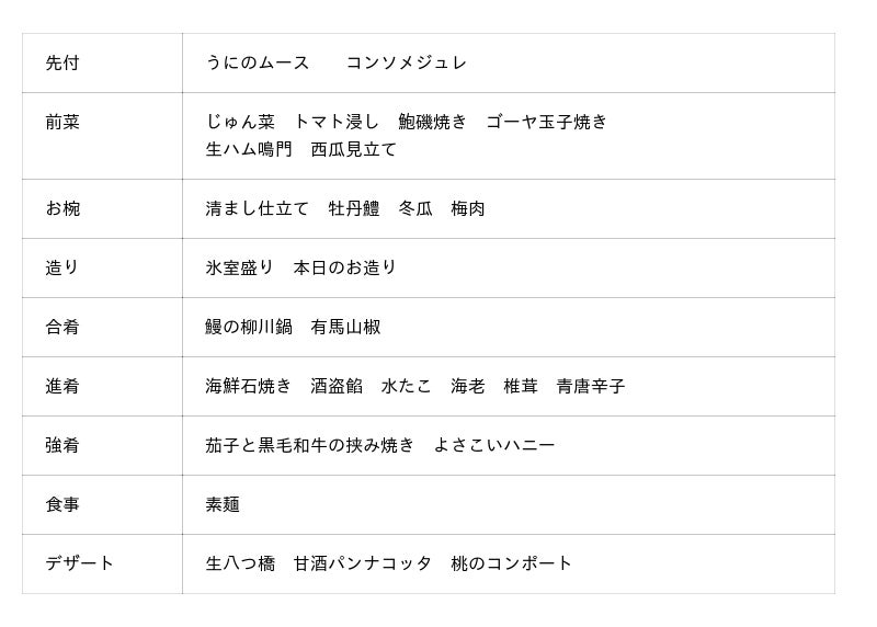 うにの濃厚な味わいと、コンソメの旨みが合わさった上品で爽やかなムースにはじまり、前菜では旬の肉厚の鮑に肝ソースをたっぷり絡めて食べる“鮑磯焼き”や、生ハムを渦のように巻いた“生ハム鳴門”、瓜をすいかのように仕上げた“西瓜見立て”など、夏らしいものに見立てた視覚的にも楽しい品々を揃えました。合肴は栄養価が高く滋養強壮に効果がある脂がのった鰻を香ばしく焼き上げ、コクのある卵でとじた“鰻の柳川鍋”をご提供します。柔らかい鰻の身、ふわふわ食感の卵、旨みたっぷりの出汁の組み合わせをご賞味ください。また、茄子のとろっとした食感と、黒毛和牛のジューシーさが相性の良い挟み焼きは食べ応え抜群の一品です。夏の食材をさまざまな調理法でお楽しみいただける全9品の会席料理です。