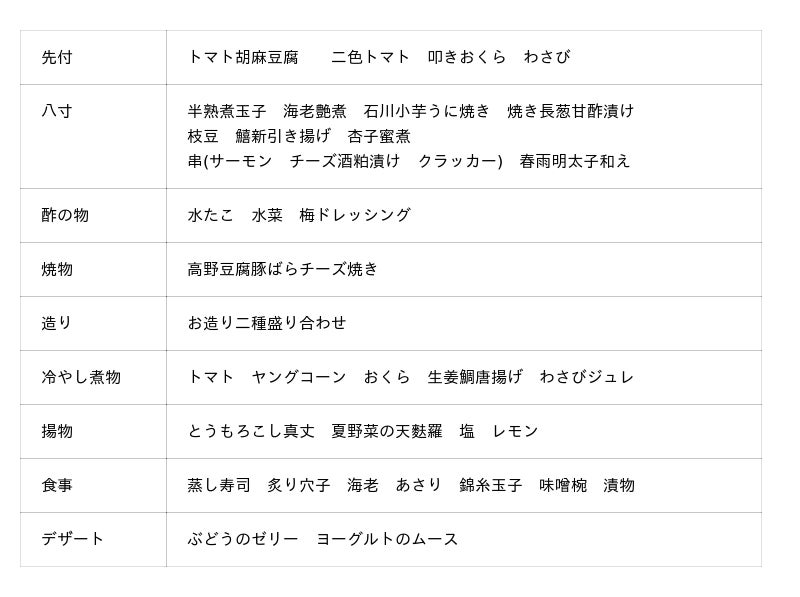 疲労回復に効果がある成分が多く含まれた豚肉を使った焼物と、旬の素材を用いた揚物やデザートがおすすめのランチ御膳です。豚肉は、栄養価が高い高野豆腐とチーズを巻いて焼き、暑い夏を乗り切る栄養満点の一品に仕上げました。揚物はぷちぷちした食感が楽しいとうもろこしの真丈と、さっぱりと召し上がっていただけるように塩レモンに合わせた夏野菜の天麩羅をご用意いたします。パティシエが作る旬のぶどうを使った華やかなデザートが食事を締めくくります。
