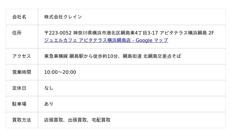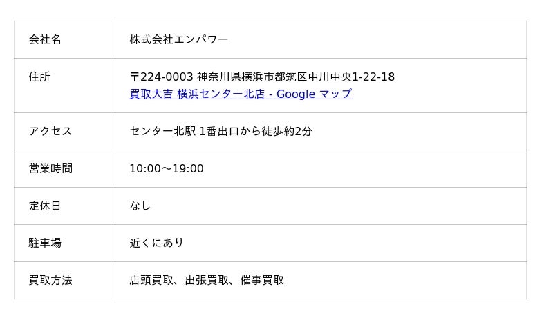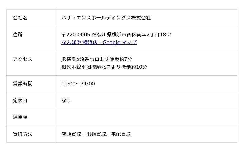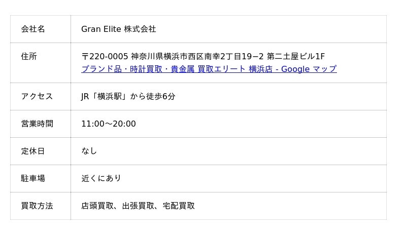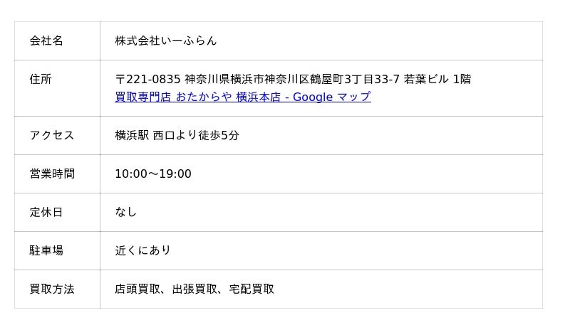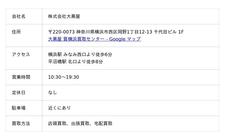 査定はLINEを使った手軽な査定にも対応し、買取方法も店頭買取、出張買取、宅配買取と柔軟に対応。こちらの店舗は横浜駅南西口から徒歩6分という好立地にあり、口コミ投稿で500円クオカードプレゼントも実施中です。