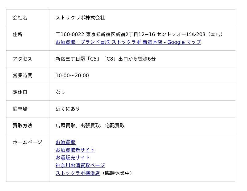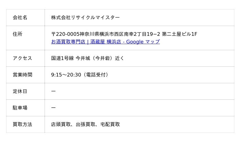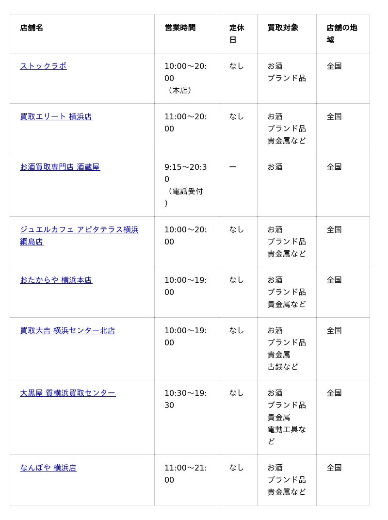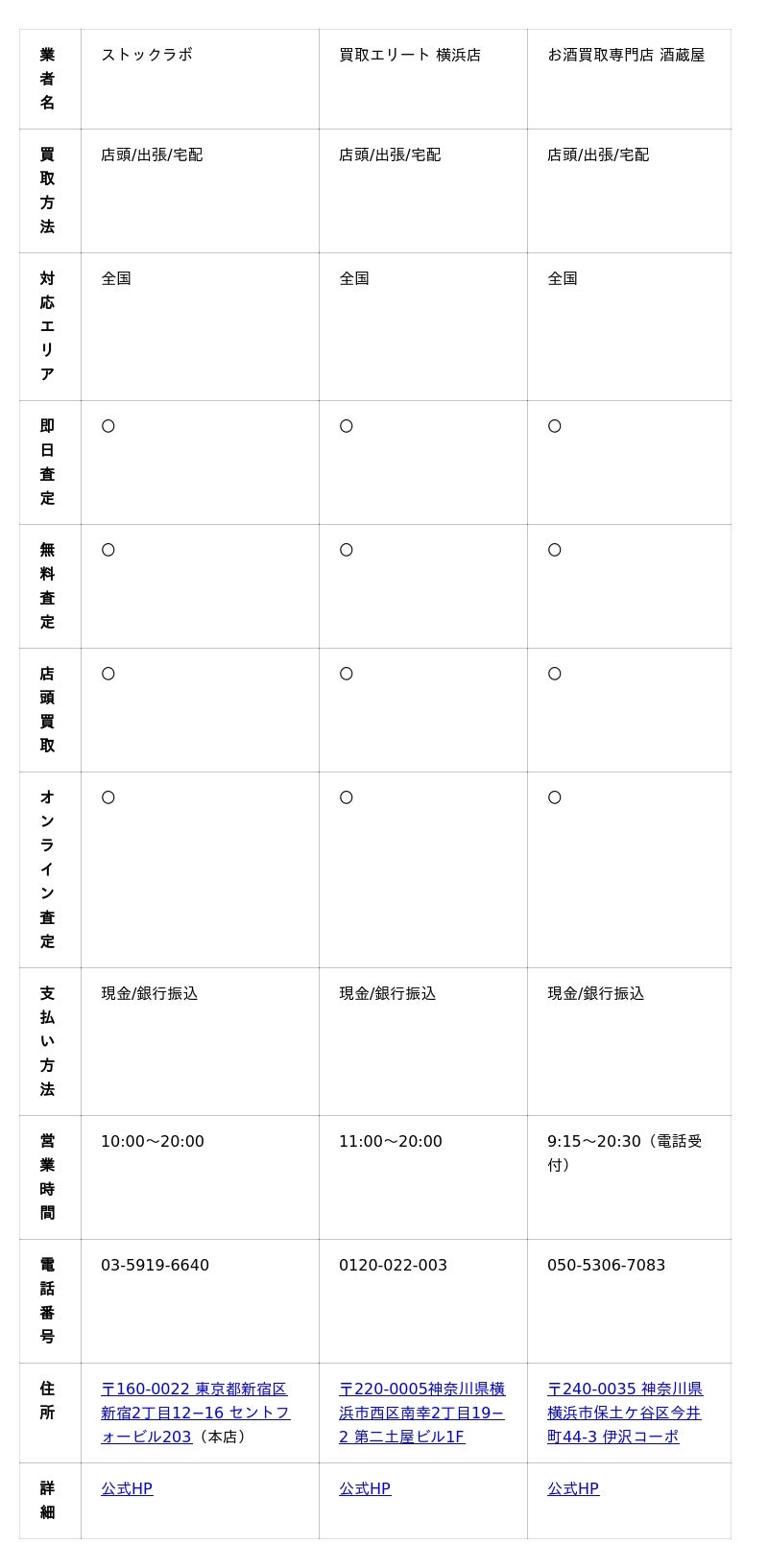 まずは、神奈川でおすすめのお酒買取店の一覧表から見てみましょう。
