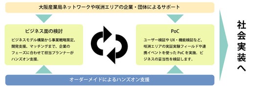 「ビジネス支援」ではビジネスモデル構築から事業戦略策定、開発支援、マッチングまで企業のフェーズに合わせて担当プランナーがハンズオン支援を行い、「PoC支援」では複合商業施設ATCを中心とした咲洲エリアをフィールドとして、実際のサービス環境の中で行う機能検証やユーザー検証を支援します。