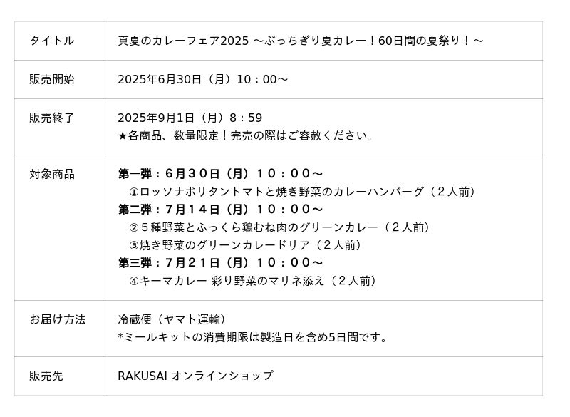 連日続く暑い夏を、スパイシーなカレーで食欲を刺激し、夏バテを吹き飛ばしていただきたいという思いから、昨年に引き続き企画しました。調理はミールキットで手軽に済ませていただけます。今回のフェアでは、RAKUSAI の新商品である「ロッソナポリタントマトと焼き野菜のカレーハンバーグ」のほか、リニューアルしたカレーメニューが続々と登場します。厳選されたカレーメニュー計 4 商品をフェア価格で随時販売いたします。(各ミールキットは数量限定のため、なくなり次第終了となります。)