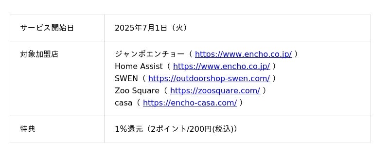 株式会社エンチョー(本社:静岡県富士市、代表取締役社長:遠藤 秀男)と、共通ポイントサービス「Ponta(ポンタ)」を運営する株式会社ロイヤリティ マーケティング(本社:東京都渋谷区、代表取締役社長:勝 文彦)は、2025年7月1日(火)、株式会社エンチョーが運営する5ブランドが「au PAY Pontaアップ店」に加盟することをお知らせします。