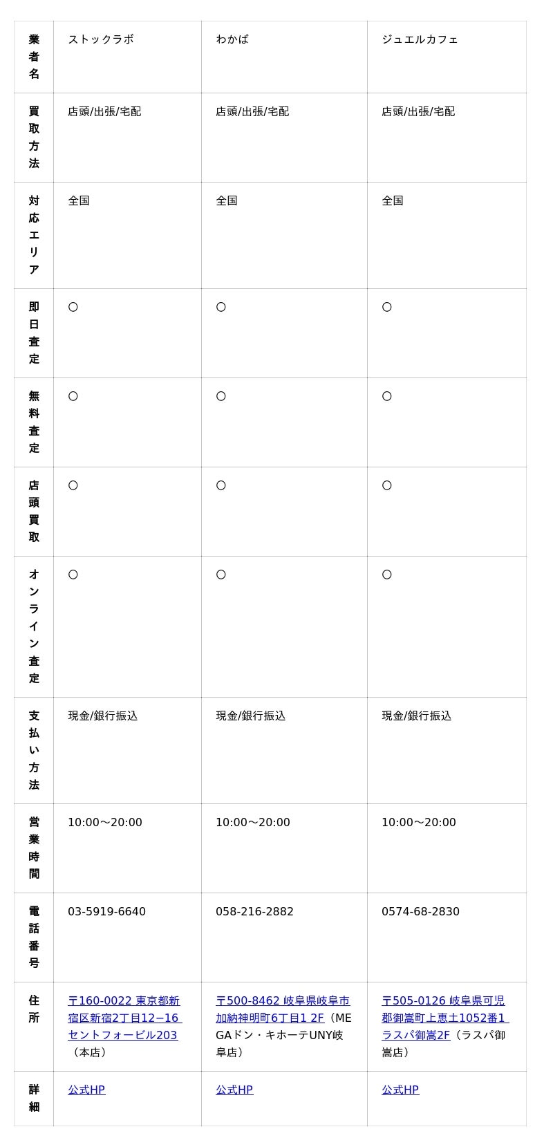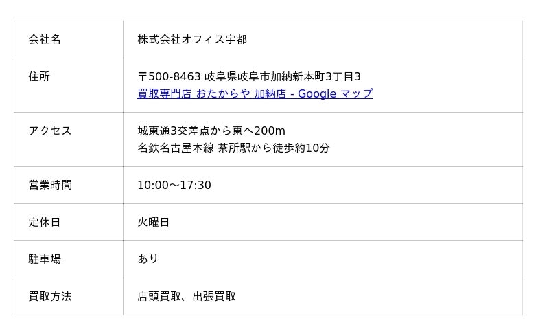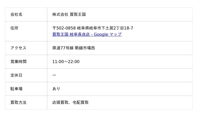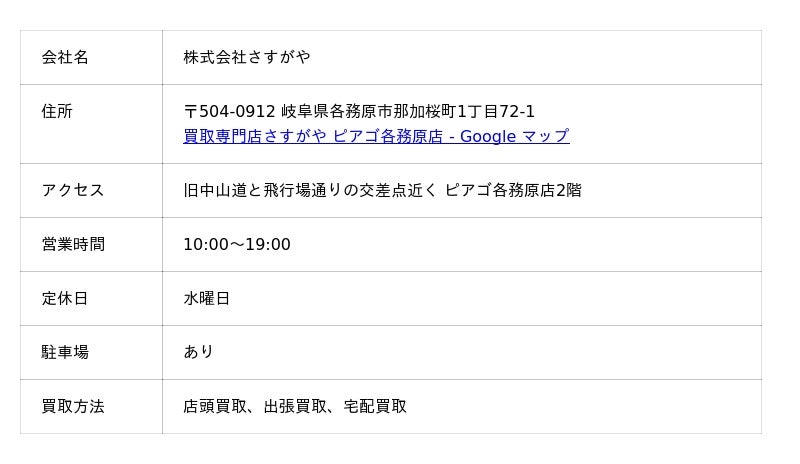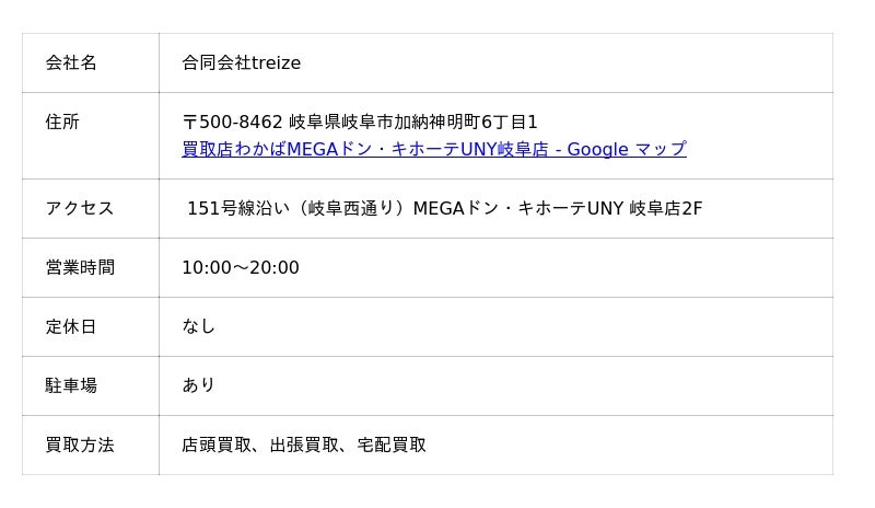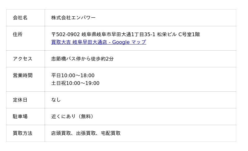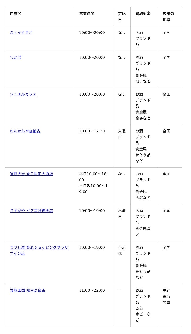 さっそく、岐阜でおすすめのお酒買取業者を8選ご紹介しましょう。まずは、今回紹介する業者と各店舗の情報を一覧表にまとめたので、そちらからご覧ください。