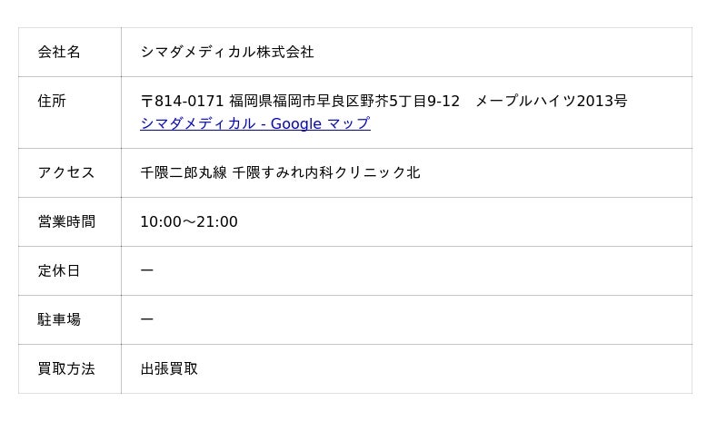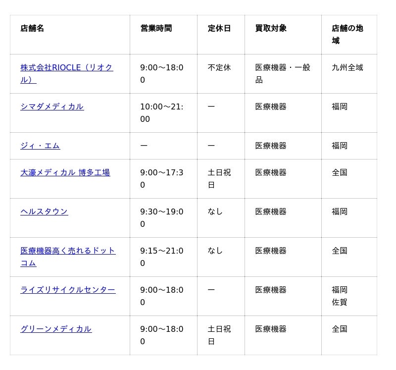 では、福岡でおすすめの医療機器の買取業者を8選ご紹介しましょう。まずは、今回紹介する業者名、および業者情報をまとめた一覧表からご覧ください。