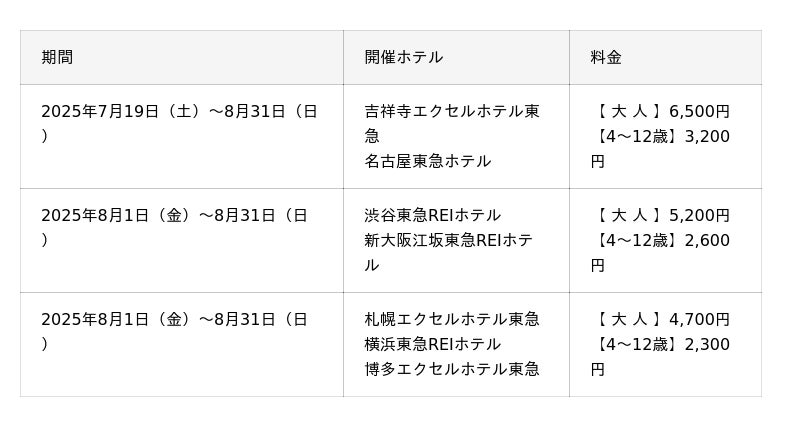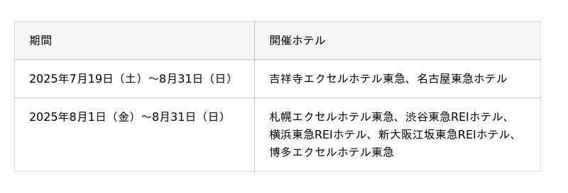 東急ホテルズ&リゾーツ株式会社(東京都渋谷区、取締役社長 武井 隆)は、2025年7月19日(土)から8月31日(日)までの期間、全国6都市の7つのホテルにて、アニメ「鬼滅の刃」とのコラボレーション企画「鬼滅の刃×東急ホテルズ スペシャルブッフェ 2025」を開催いたします。予約受付は、7月1日(火)15:00より開始いたします。