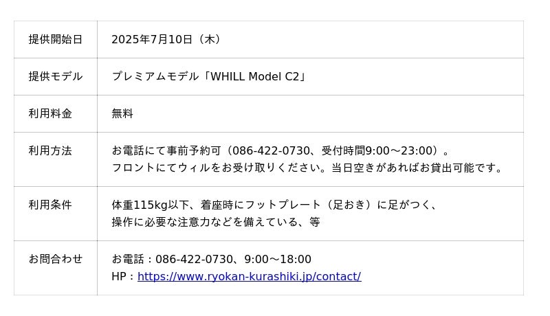 WHILL社は今後も、旅館くらしきをはじめとしたさまざまなステークホルダーとの連携を通じ、移動の面から安心快適でインクルーシブな滞在体験を提案してまいります。