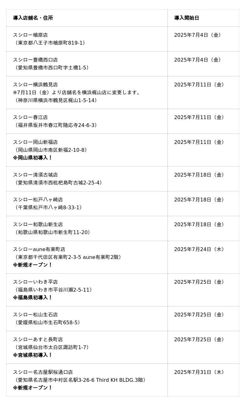 7月は県内初として岡山新福店(岡山県)、いわき平店(福島県)、あすと長町店(宮城県)にデジローが導入されます。また、新たにオープンするaune有楽町店(東京都)、名古屋駅桜通口店(愛知県)にもデジローが登場し、7月末で日本国内の「デジロー」導入は110店舗(未来型万博店を含む)となります。スシローではこれまでも様々な面でデジタルの力を活用していますが、今後も“うまいすし”に加えて、新たな店舗体験をご提供することで、いつ来ても楽しんでいただける店舗空間を作り続けたいと考えています。