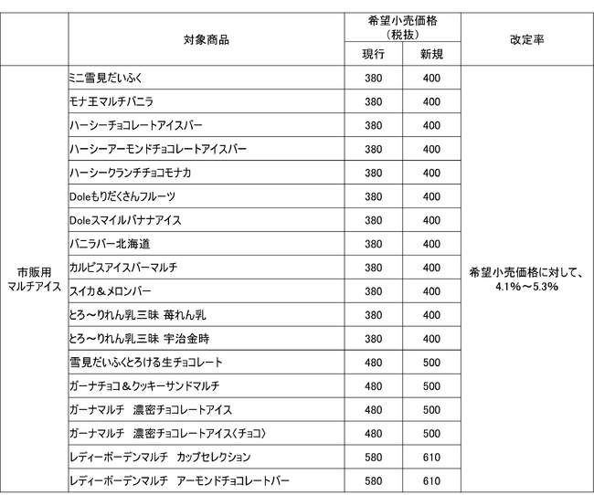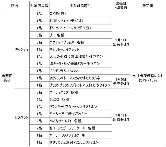 市場を取り巻く環境におきましては、原材料や包装資材の価格、物流コストの上昇が続いております。弊社といたしましては、これまで品質を維持しながら合理化・効率化によりコストアップを吸収する努力を続けてまいりました。しかしながら、企業努力によるコスト上昇の吸収がより一層困難な状況となっており、やむを得ず下記商品について価格改定を実施させていただきます。