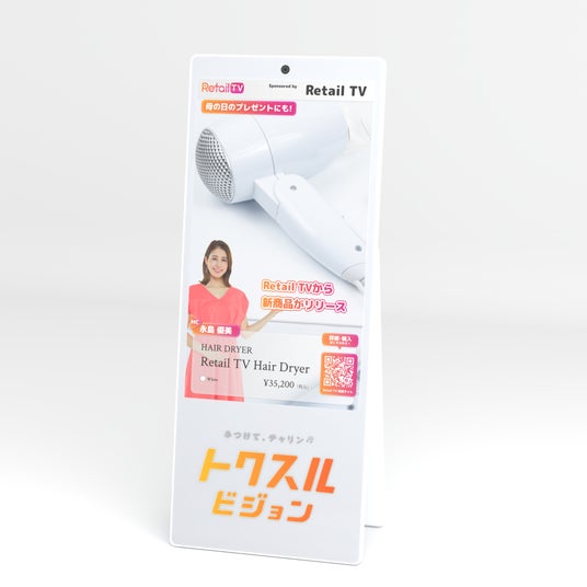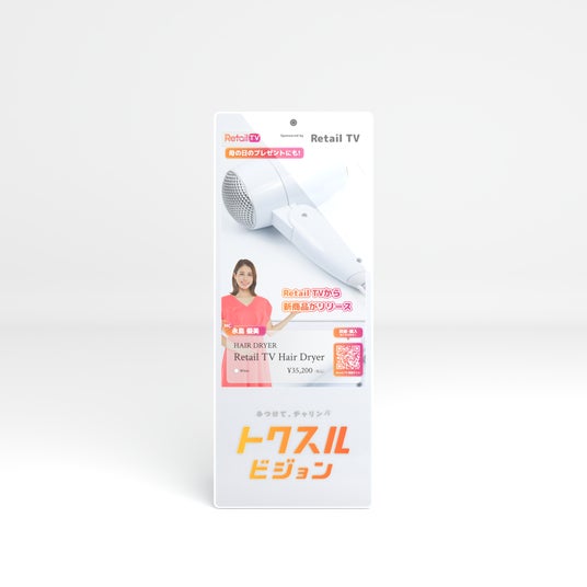 Retail TVは、店舗の入り口や受付など、来店顧客との接点となる場所に設置されたサイネージを通じて、月替わりの番組形式で情報を発信する新しいリテールメディアです。視聴者がその場で興味を持った商品を購買・検索・SNS投稿などへと自然につなげる導線を設計し、従来の「買う場所」だった店舗空間を、「知るメディア」へと進化させます。