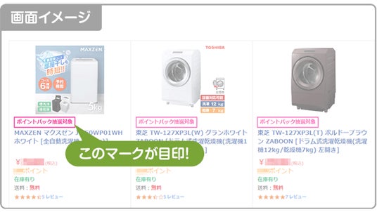 また、期間中は商品を検索したとき、ポイントバックのキャンペーン対象商品には【ポイントバック抽選対象】マークがついています。