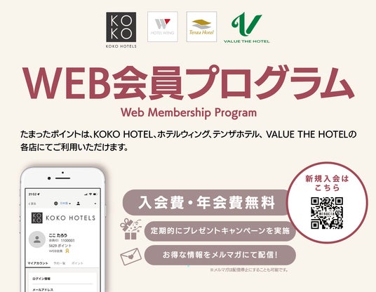 ポラリス・ホールディングス株式会社(本社:東京都千代田区、代表取締役社長:田口洋平)の子会社である株式会社フィーノホテルズ・株式会社ココホテルズが運営するKOKO HOTELおよび VALUE THE HOTELは、2025年7月1日(火)より、WEBポイントプログラムを始動いたします。公式サイトのWEB予約で貯まったポイントは、グループホテルのHOTEL WINGおよびTENZA HOTELでも使用可能となっております。