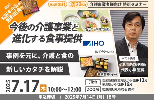 株式会社Cqree(本社:東京都品川区、代表取締役:鶴田晃平)は、7月17日(木)に高齢者施設における「今後の介護事業と進化する食事提供」をテーマにした共催セミナーを開催決定いたしましたことをご案内申し上げます。