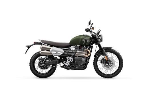 冒険心あふれるSCRAMBLER 1200 Xは、トライアンフの象徴であるマットカーキグリーンのカラーリングを採用したタンクを設定。ファントムブラックのヘッドライトボウル、サイドパネル、マッドガードによって、ミリタリーを彷彿とさせる無骨で力強いデザインを実現しました。