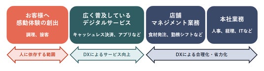 トリドールグループは、価値を創造し続けるため、人の手による「食の感動体験」の創出にこだわり続けます。一方、投下資金や売上高に対する収益力を高めるために、お客さまにおける体験価値に直結しない業務はDXにより徹底的に合理化していきます。
