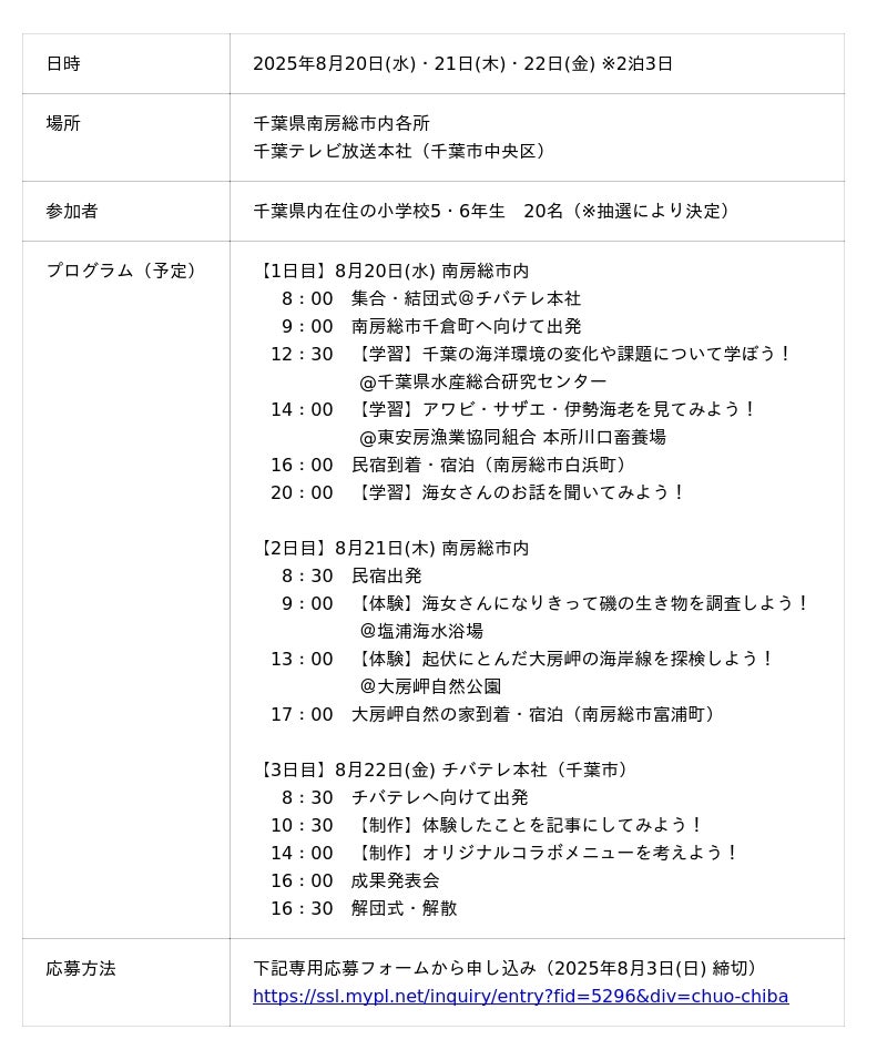 一般社団法人海と日本プロジェクトin千葉県は、2025年8月20日(水)・21日(木)・22日(金)に千葉県内の小学生20名を集め、「千葉の海っ子調査隊」を結成し、千葉伝統の海女文化を学び、海の未来を考えるイベントを開催します。千葉の海洋環境の変化や課題について、座学や畜養場見学、海女体験などを通して学ぶ、体験型学習プログラムです。また、体験後には体験したことを新聞記事にまとめると共に、千葉県内にチェーン展開している和食レストラン「すしめん処 大京」とコラボしたオリジナルメニューを開発します。このイベントは、次世代へ豊かで美しい海を引き継ぐために、海を介して人と人とがつながる“日本財団「海と日本プロジェクト」”の一環です。