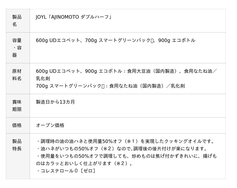 株式会社J-オイルミルズ(東京都中央区、代表取締役社長執行役員 CEO:春山 裕一郎 以下当社)は、揚げものにも炒めものにも使え、調理時の油ハネも油の量もいつもの50%オフ(※1)になるクッキングオイルJOYL「AJINOMOTO ダブルハーフ」のパッケージデザインを一新し、8月20日(水)より全国で順次発売します。