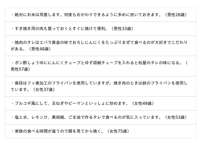 自宅で焼肉を食べる状況や好きな肉などについて聞いています。調査結果をお知らせいたします。