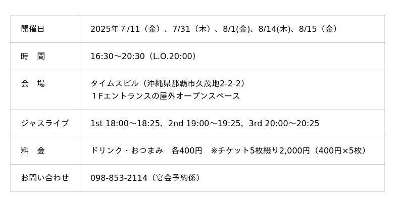 2025年に開業50周年を迎える沖縄ハーバービューホテル(沖縄県那覇市泉崎2-46/総支配人:森山 真也)は、2025年7月11日(金)、31日(木)、8月1日(金)、14日(木)、15日(金)の5日間、タイムスビル(沖縄県那覇市久茂地2-2-2)1Fエントランスの屋外オープンスペースでビールとジャズを楽しむスペシャルイベント「沖縄ハーバービューホテル50th Anniversary Beer Night with 沖縄セルラー」を開催します。