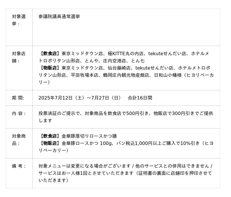 2025年7月20日(日)に投開票される参議院議員通常選挙の「投票済証」をご提示いただいた方に次のサービスをいたします。※「投票済証」が受け取れない投票所の場合は、投票に参加したことを確認できる画像の提示で適用いたします。