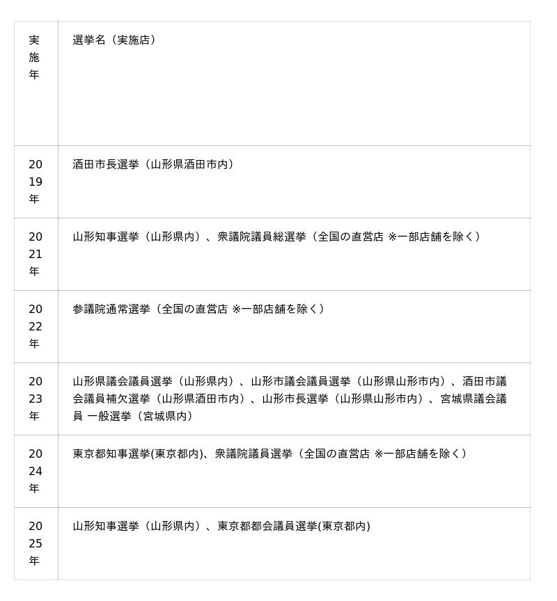 に広がりを見せています。当社での実施は、2019年8月の酒田市長選挙(山形県酒田市内のみ)、2021年7月の山形知事選挙(山形県内のみ)、2021年衆議院議員総選挙(全国の直営店※一部店舗を除く)、2022年参議院通常選挙(全国の直営店※一部店舗を除く)、2023年山形県議会議員選挙、2023年山形市議会議員選挙、2023年酒田市議会議員補欠選挙(酒田市内のみ)、2023年山形市長選挙(山形市内のみ)、